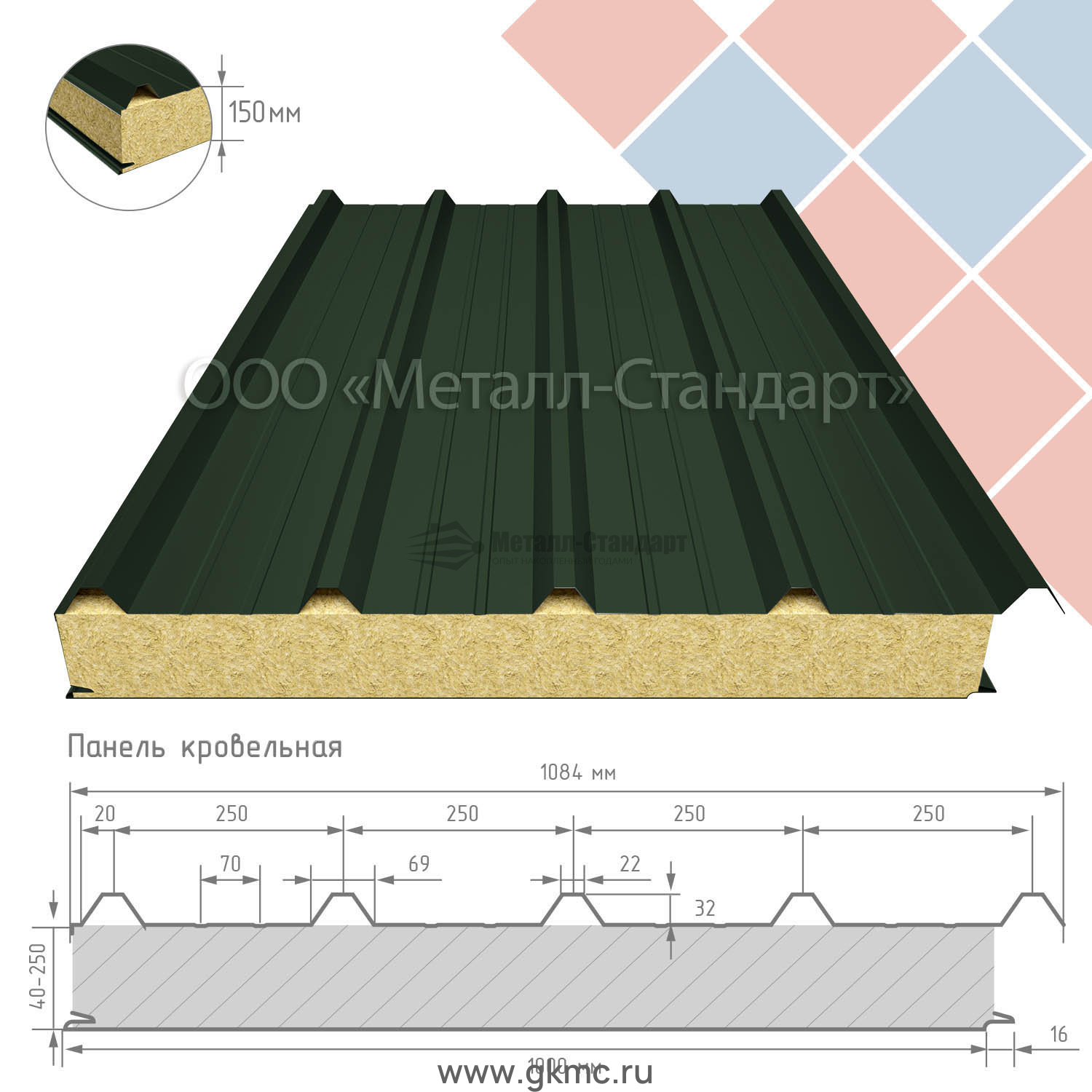 Кровельная сэндвич-панель 150 мм утеплитель пенополистирол RAL 6020 Хромовый зелёный